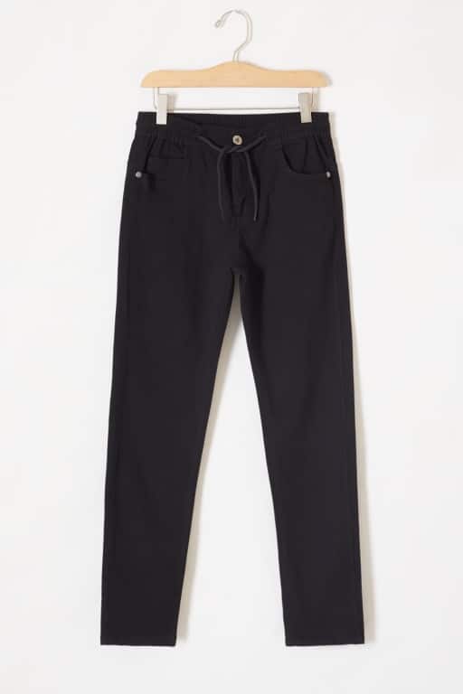 - Belden lastikli düz siyah kumaş pantolon,